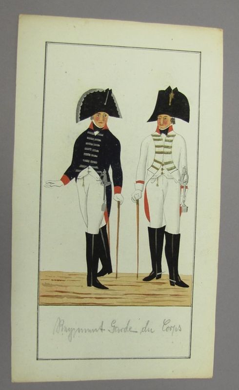 Uniforme: Paille Collets, karmoisin-rothe Aufschläge u. Kragen, rothe Vesten mit Silber.
