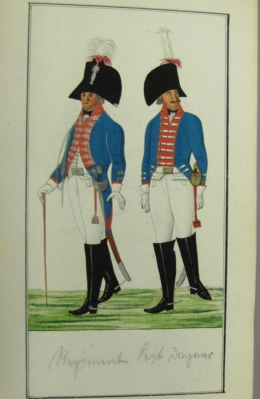 Uniforme: hellblaue Röcke, ponceau rothe Aufschläge, Klappen und Kragen mit Silber, Achselbänder, weisse Unterkleider.
